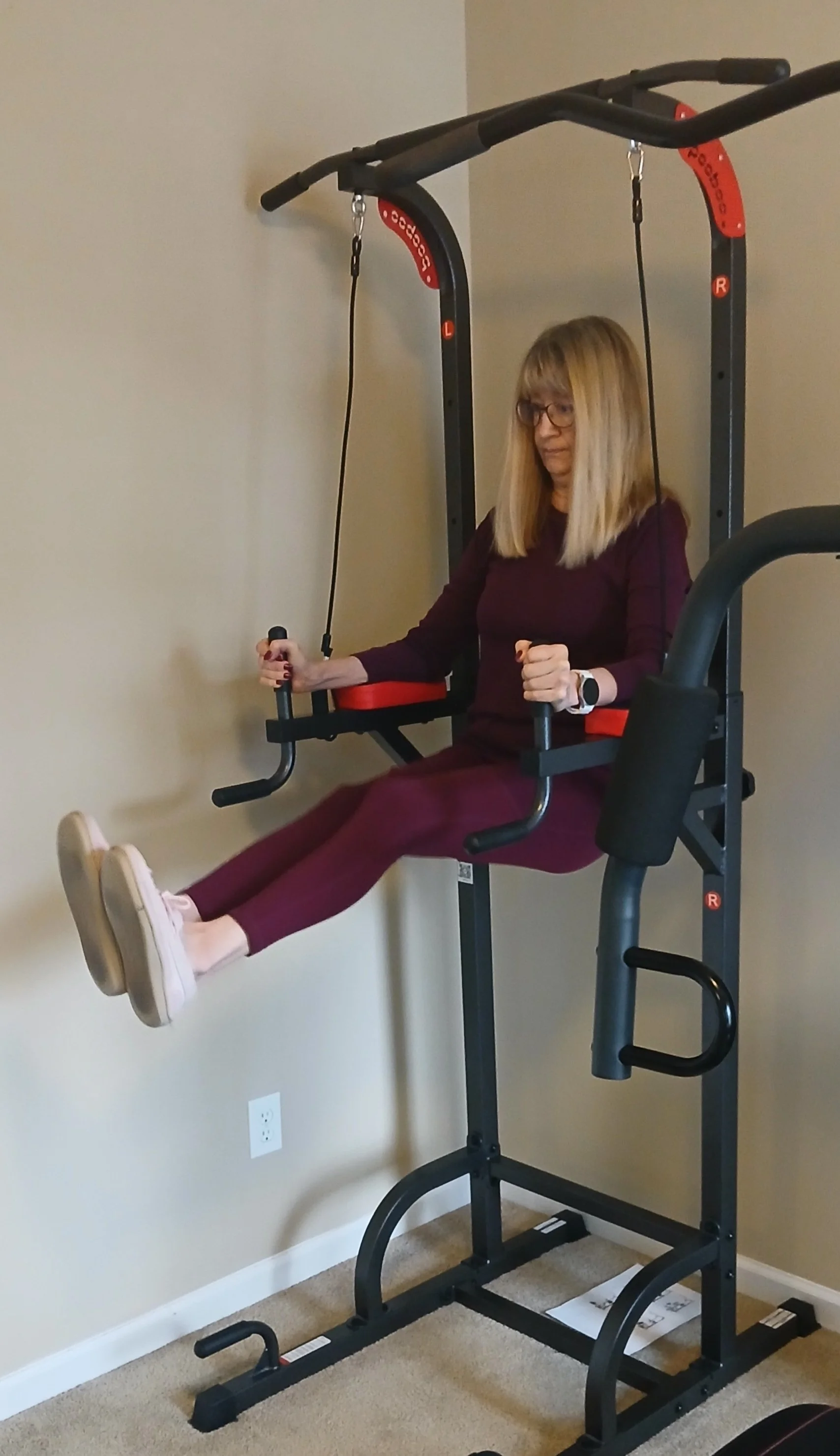 Tammie has really taken to this machine and daily does between 10-20 repetitions of dead hang belly crunchers and knee raises. She also does 10-20 repetitions of variations of vertical knee and leg raises. Finally, she stands next to the tower to complete a variety of leg lifts (side, front, back, diagonal) and hip flexors each having 10 repetitions.